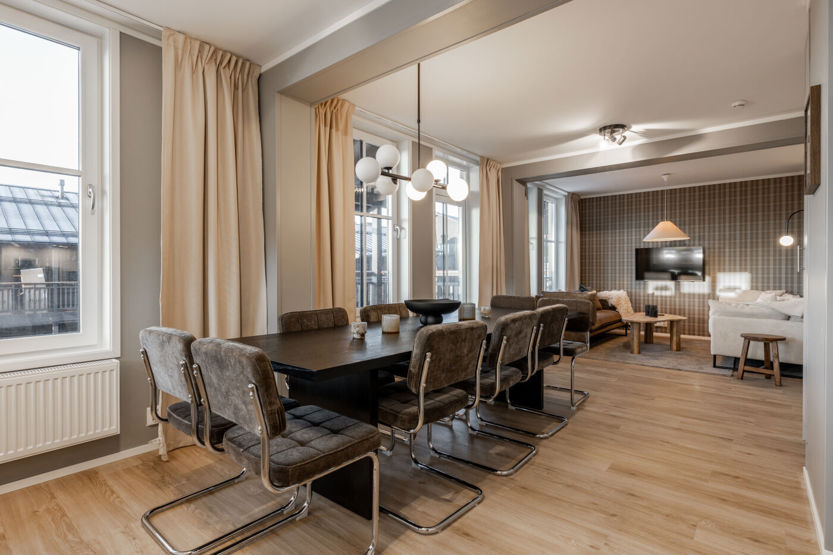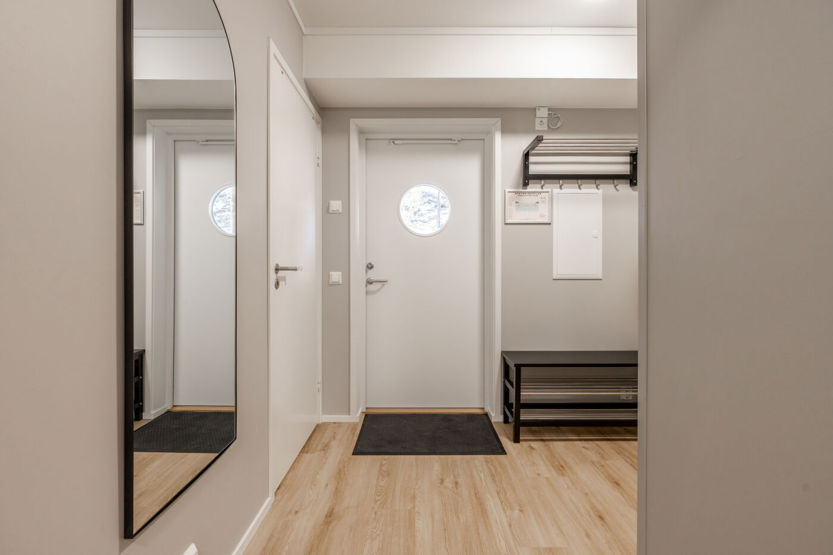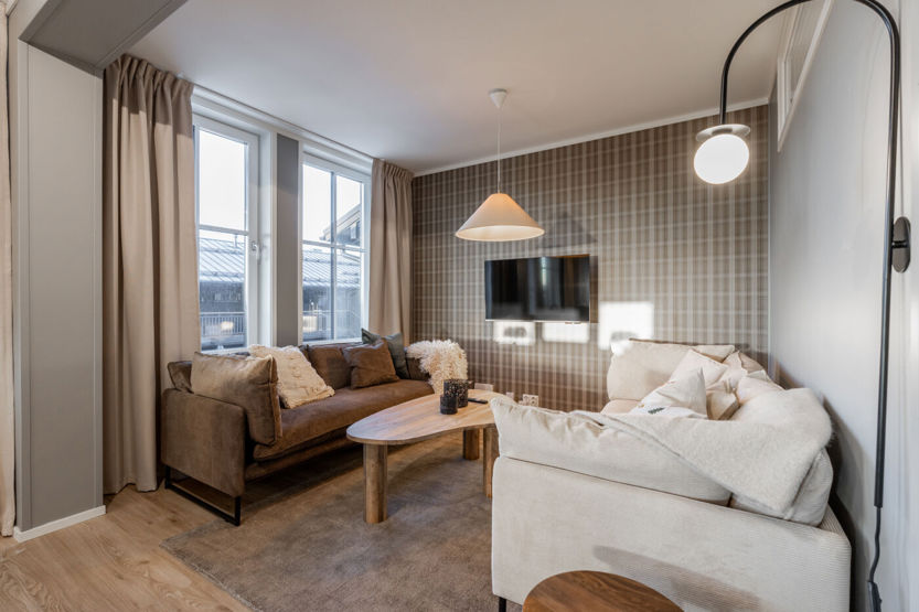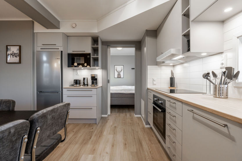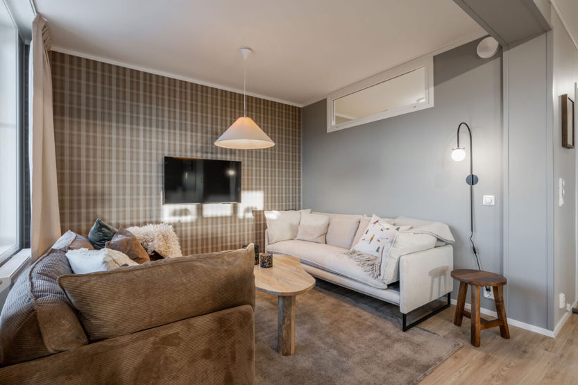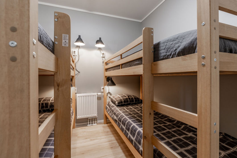 Lejlighed på 84 kvadratmeter. Denne komfortable lejlighed på 84 kvadratmeter er et glimrende valg til en stor gruppe. Indkvarteringen har fire soveværelser - det ene er møbleret med en dobbeltseng, to har hver køjesenge, og det fjerde soveværelse er udstyret med to køjesenge. Der er i alt ti sovepladser, hvilket gør indkvarteringen perfekt til både familier og vennegrupper, der ønsker masser af plads under deres ophold i fjeldet.