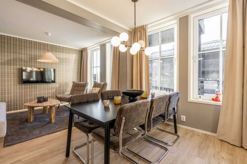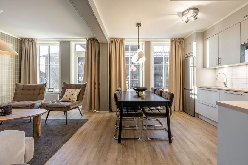 Lejlighed på 57 kvadratmeter. Denne hyggelige lejlighed på 57 kvadratmeter er ideel til familier eller små grupper, der søger komfortabel indkvartering i et bjergrigt miljø. Der er to soveværelser - det ene er møbleret med en dobbeltseng og det andet med to køjesenge, hvilket giver i alt seks sovepladser. Badeværelset er udstyret med toilet, bruser og privat sauna. Lejligheden har et funktionelt køkken med opvaskemaskine og alt det basale køkkenudstyr, du har brug for til at tilberede lækre måltider. Wifi er tilgængeligt i hele boligen. Uden for huset er der elbilopladere til dem, der rejser med elbiler. Rygning er ikke tilladt. Lejligheden er tilgængelig til leje fra 21. december 2025.