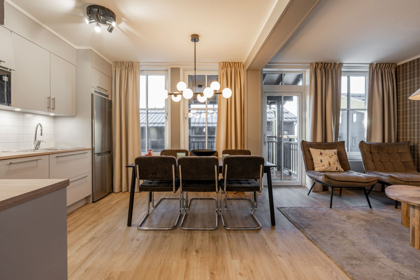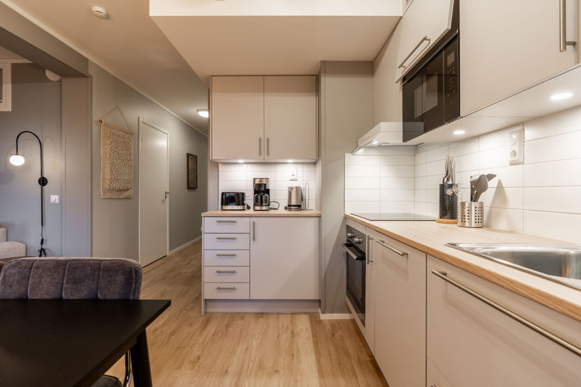 Lejlighed på 57 kvadratmeter. Denne hyggelige lejlighed på 57 kvadratmeter er ideel til familier eller små grupper, der søger komfortabel indkvartering i et bjergrigt miljø. Der er to soveværelser - det ene er møbleret med en dobbeltseng og det andet med to køjesenge, hvilket giver i alt seks sovepladser. Badeværelset er udstyret med toilet, bruser og privat sauna. Lejligheden har et funktionelt køkken med opvaskemaskine og alt det basale køkkenudstyr, du har brug for til at tilberede lækre måltider. Wifi er tilgængeligt i hele boligen. Uden for huset er der elbilopladere til dem, der rejser med elbiler. Rygning er ikke tilladt. Lejligheden er tilgængelig til leje fra 21. december 2025.