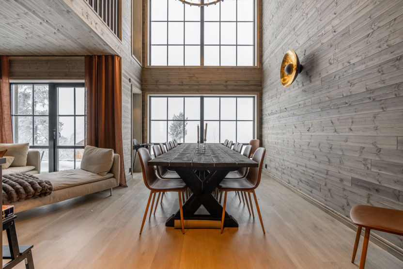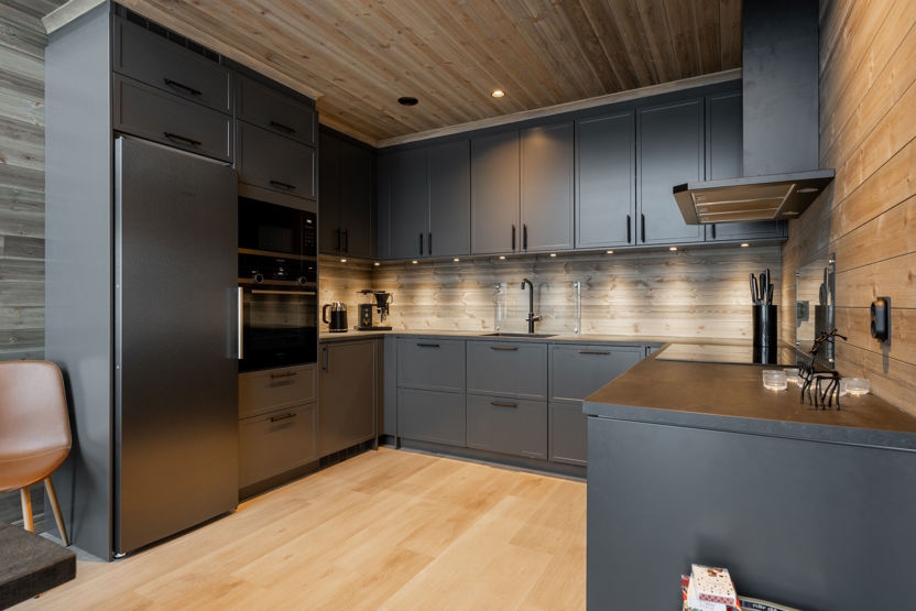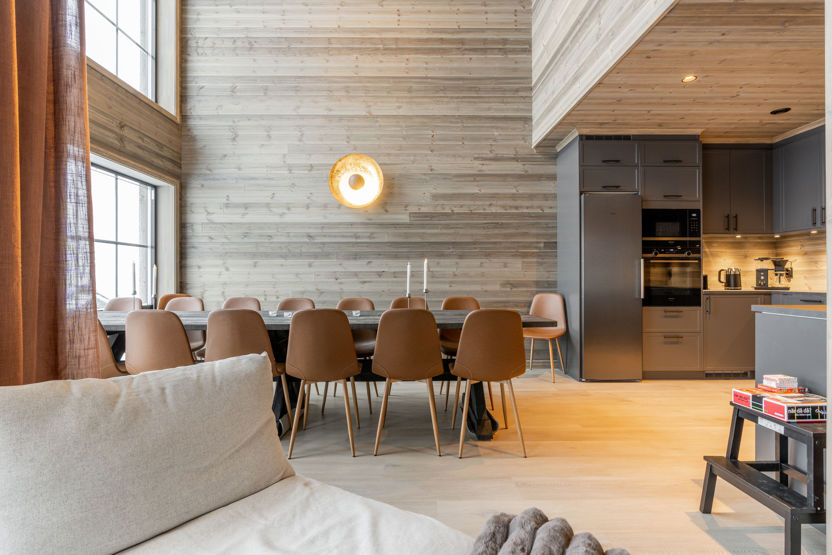 Köket, matrum och allrum har öppen planlösningen. I köket och matrum är det högt i tak, vacker utsikt och mycket naturligt ljus från de stora fönsterna. Köket har kyl. I allrummet finns bekväma sittplatser, tv och en mysig kamin, en plats att samlas på efter en aktiv dag utomhus.