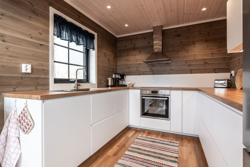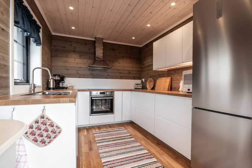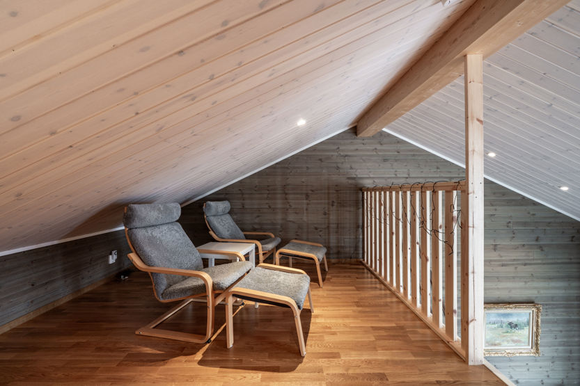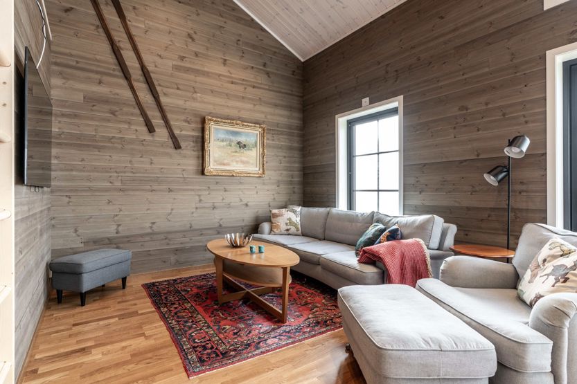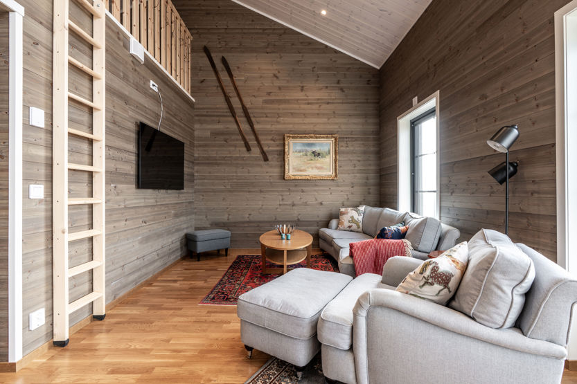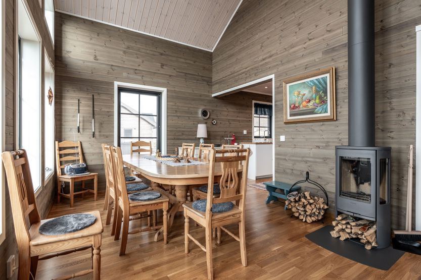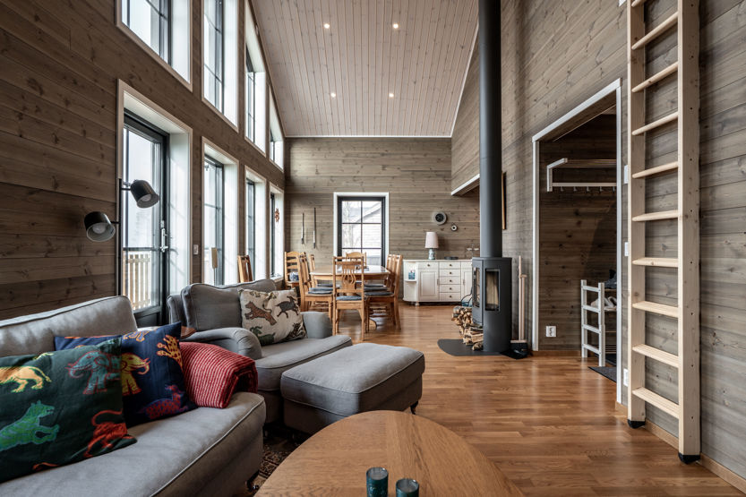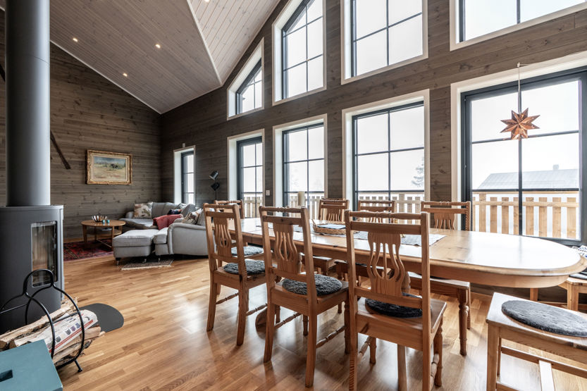 Det öppna allrummet har braskamin och generösa ytor för umgänge. Här finns matplats, sittgrupp och stora fönster som ger utsikt mot fjällmiljön. Köket är fullt utrustat för gemensamma måltider.