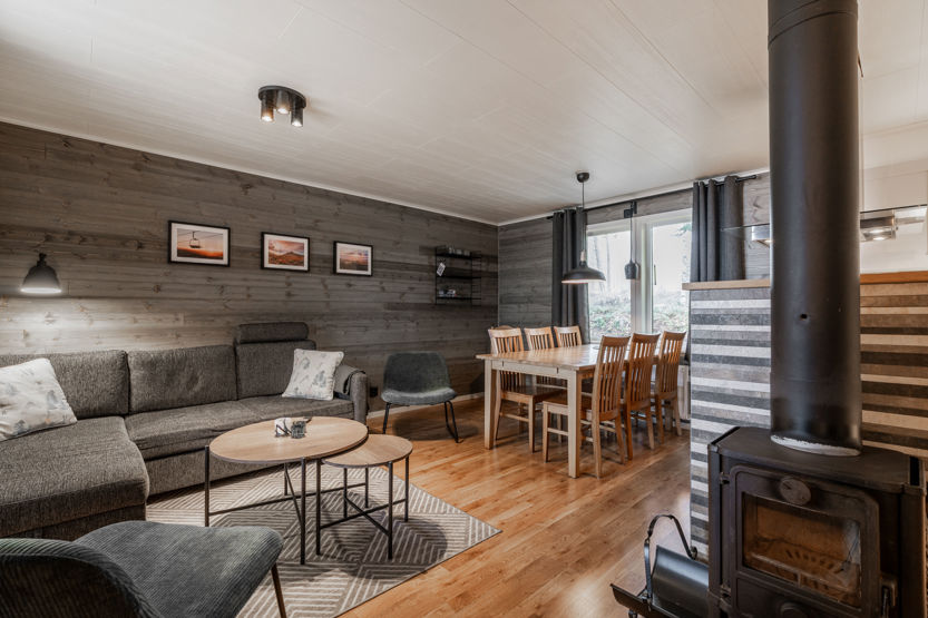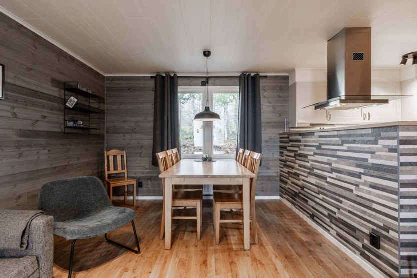 Pænt dobbelthus i Skogsbyn med plads til op til 6+2 personer. Her er det en åben planløsning med køkkenalrum, spiseplads, tv-hjørne og brændeovn, der skaber en hyggelig atmosfære.