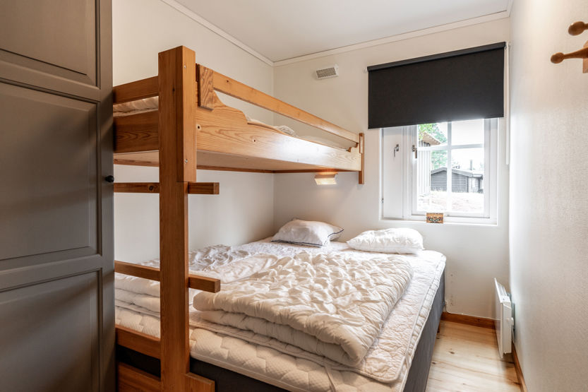 Soveværelse 1 har en køjeseng og soveværelse 2 har to køjesenge.
