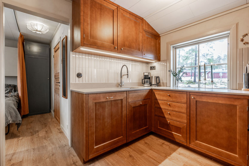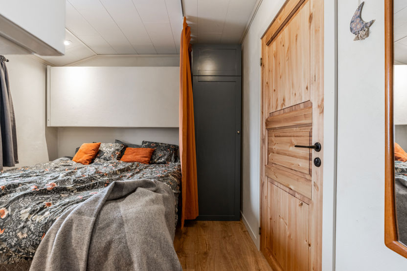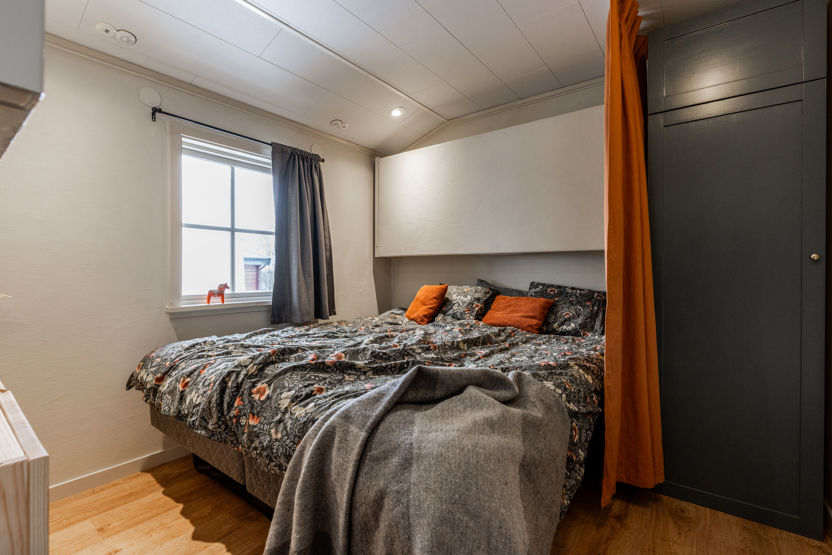 Hytten har to sovealkover. Sovelkove 1 har to enkeltsenge og to nedfældbare vægsenge. Sovelkove 2 har en enkeltseng og en nedfældbar vægseng.