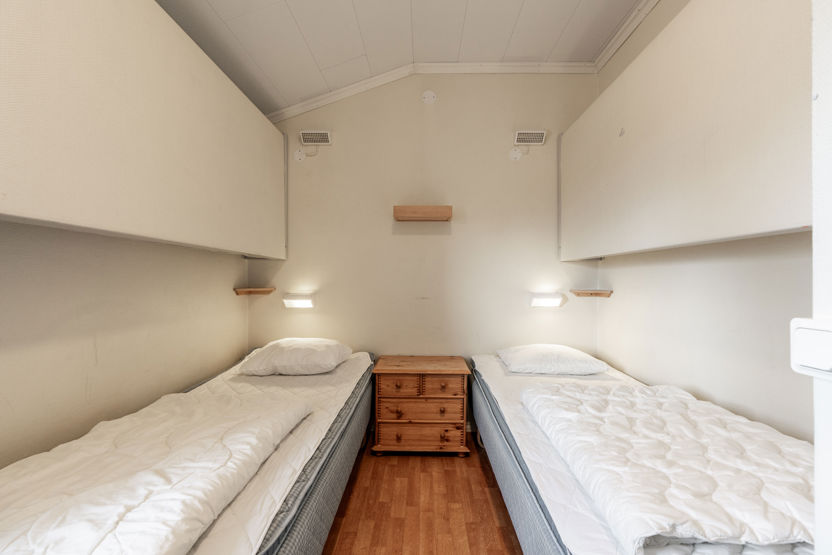 Hytten har to soveværelser. Soveværelse 1 har to enkeltsenge og to nedfældbare vægsenge, soveværelse 2 har en køjeseng, hvor den nederste køjeseng er 105 cm bred.