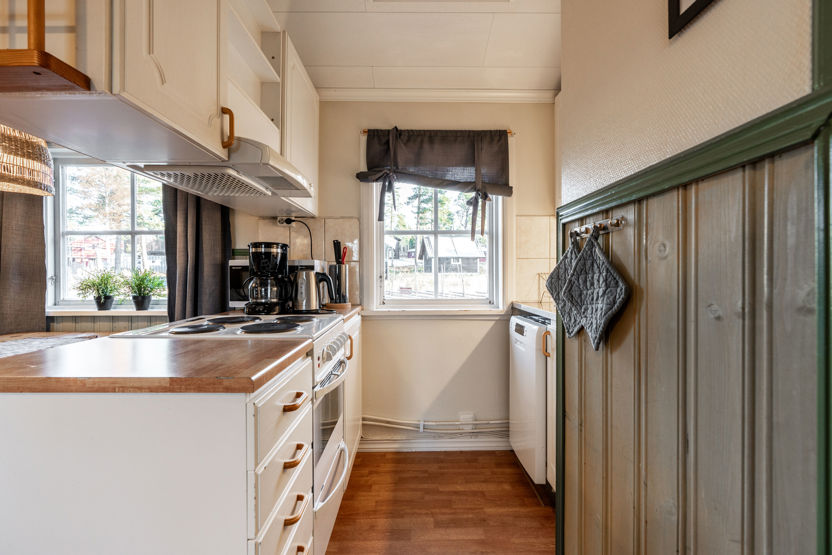 Køkkenområdet er udstyret med komfur, mikrobølgeovn og køleskab med frostboks.
