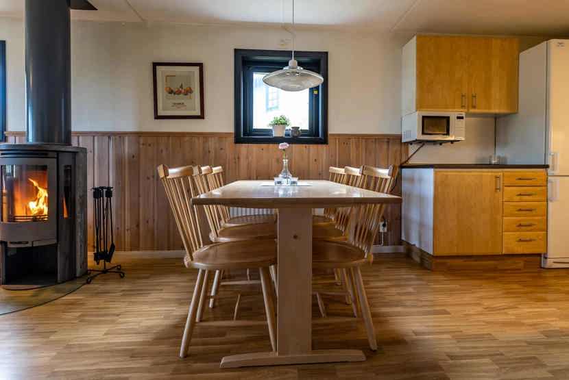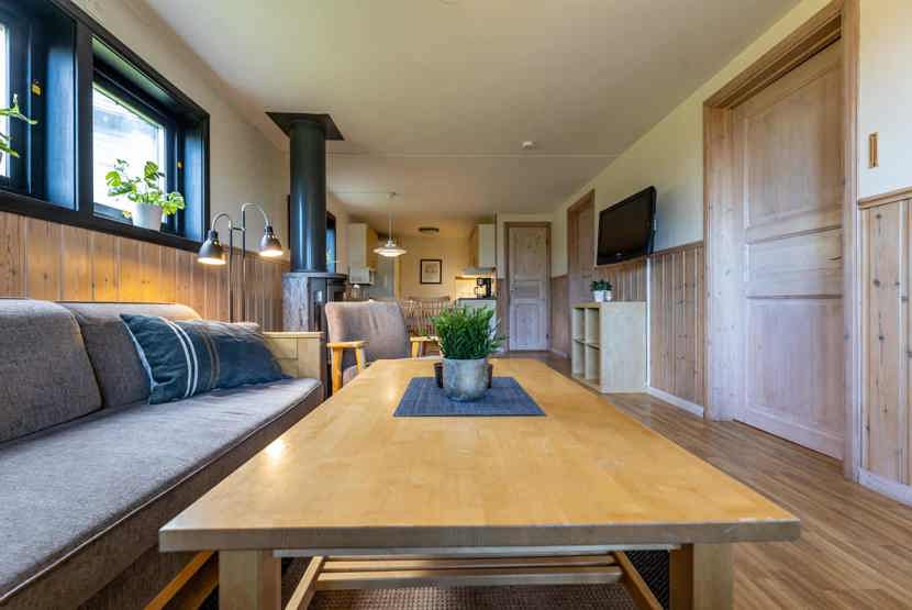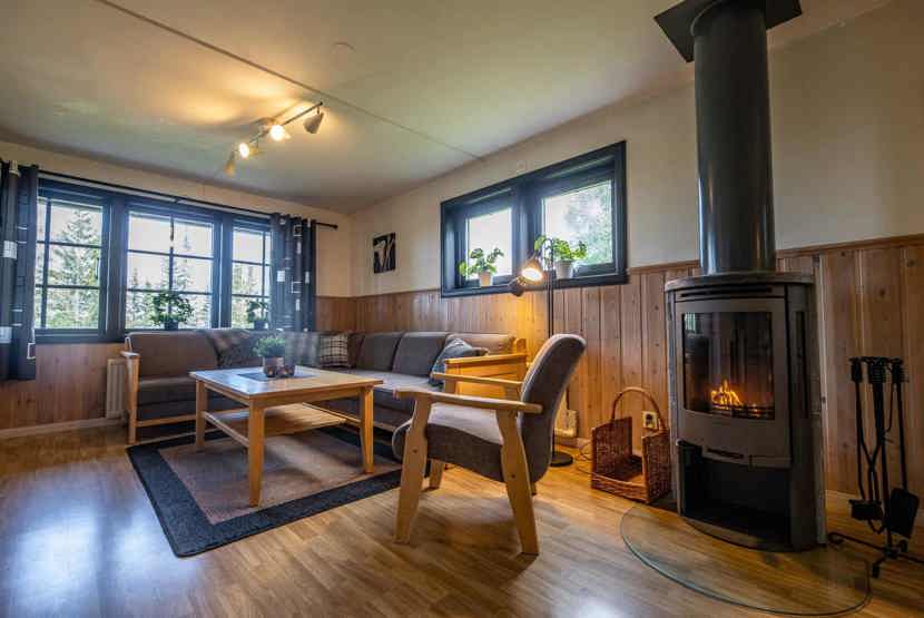 Opholdsstue med køkkenafdeling. TV, brændeovn (brænde indgår ikke), tørreskab, rum til skiudstyr, altan (skovles ikke), 1 parkeringsplads.