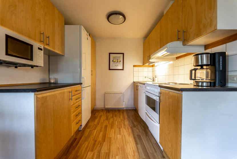 Køkkenet indeholder: elkomfur med ovn, microovn, opvaskemaskine, køleskab, frys.