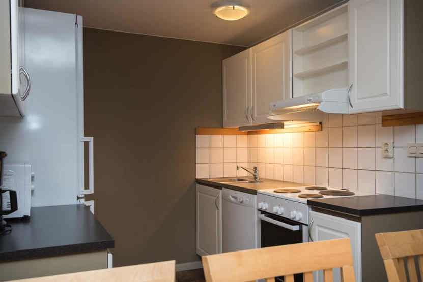 Køkkenet indeholder: elkomfur med ovn, microovn, opvaskemaskine, køleskab, frys.
