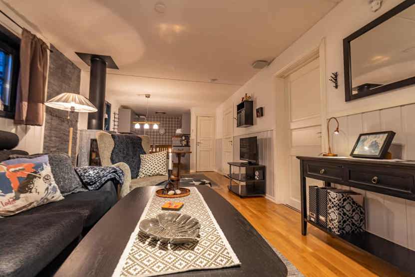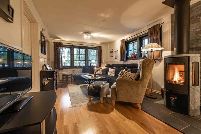 Opholdsstue med køkkenafdeling. TV, brændeovn (brænde indgår ikke), tørreskab, rum til skiudstyr, altan (skovles ikke), 1 parkeringsplads.