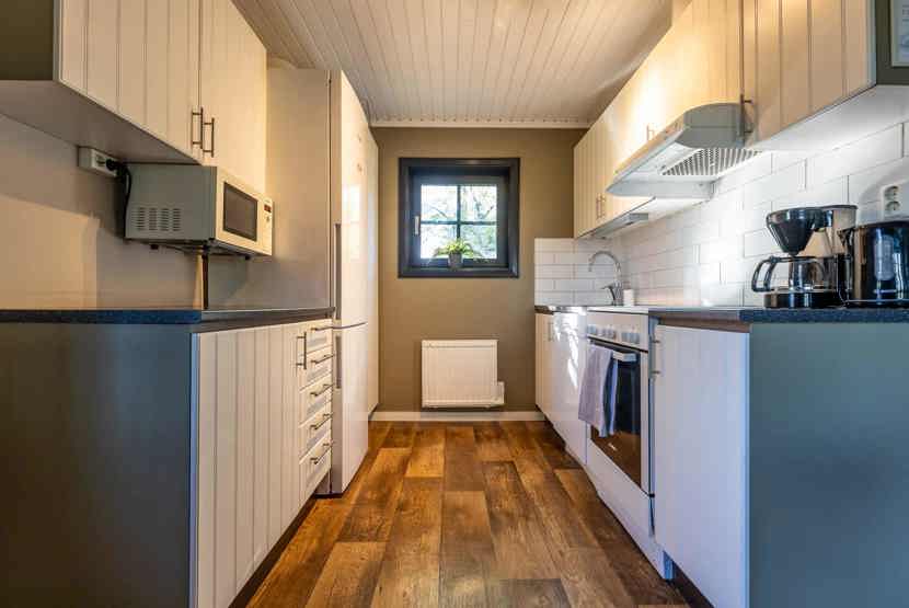 Køkkenet indeholder: elkomfur med ovn, microovn, opvaskemaskine, køleskab, frys.