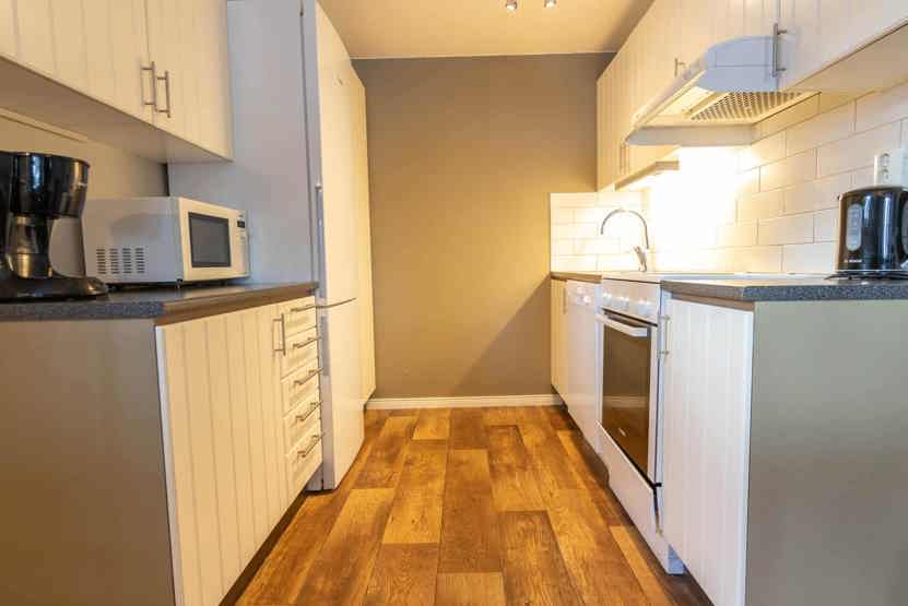 Køkkenet indeholder: elkomfur med ovn, microovn, opvaskemaskine, køleskab, frys.