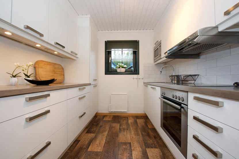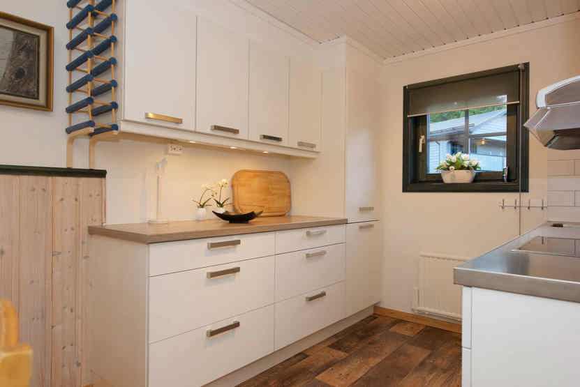 Køkkenet indeholder: elkomfur med ovn, microovn, opvaskemaskine, køleskab, frys.