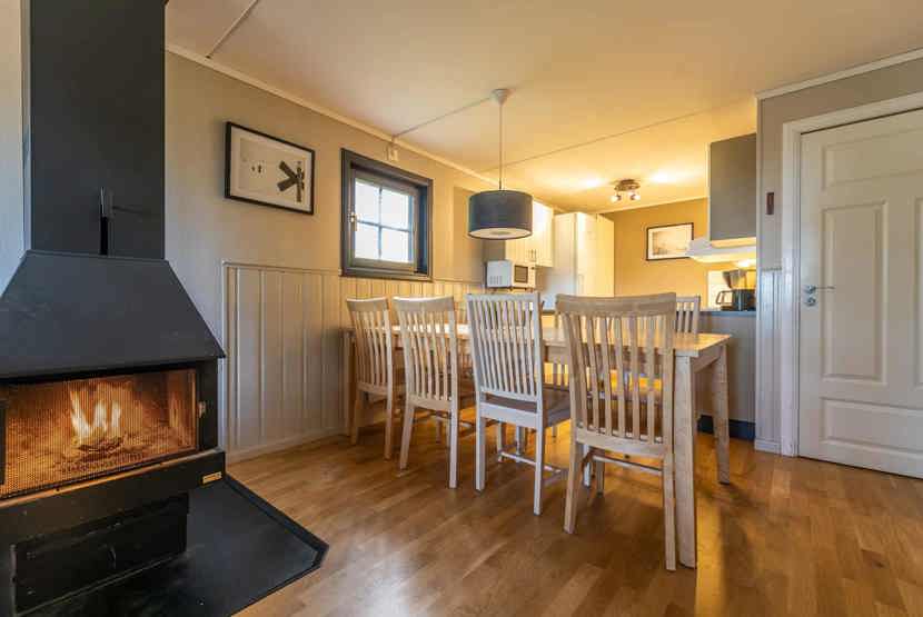 Opholdsstue med køkkenafdeling. TV, brændeovn (brænde indgår ikke), tørreskab, rum til skiudstyr, altan (skovles ikke), 1 parkeringsplads.