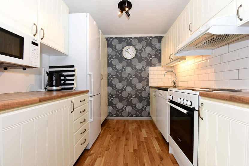Køkkenet indeholder: elkomfur med ovn, microovn, opvaskemaskine, køleskab, frys.
