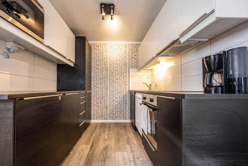Køkkenet indeholder: elkomfur med ovn, microovn, opvaskemaskine, køleskab, frys.