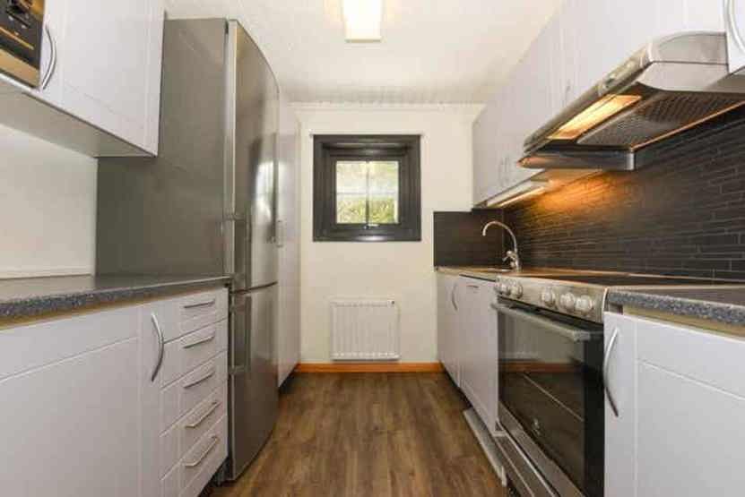 Køkkenet indeholder: elkomfur med ovn, microovn, opvaskemaskine, køleskab, frys.
