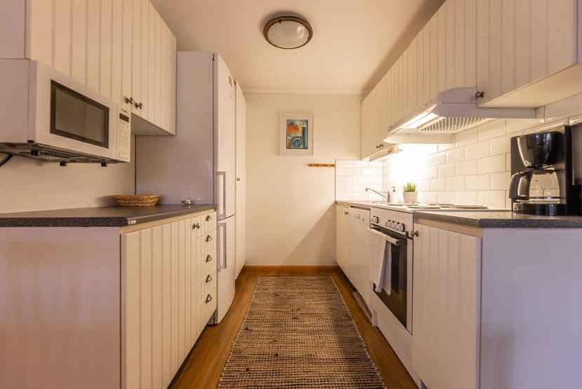 Køkkenet indeholder: elkomfur med ovn, microovn, opvaskemaskine, køleskab, frys.