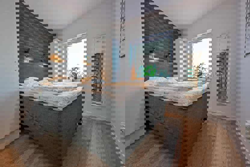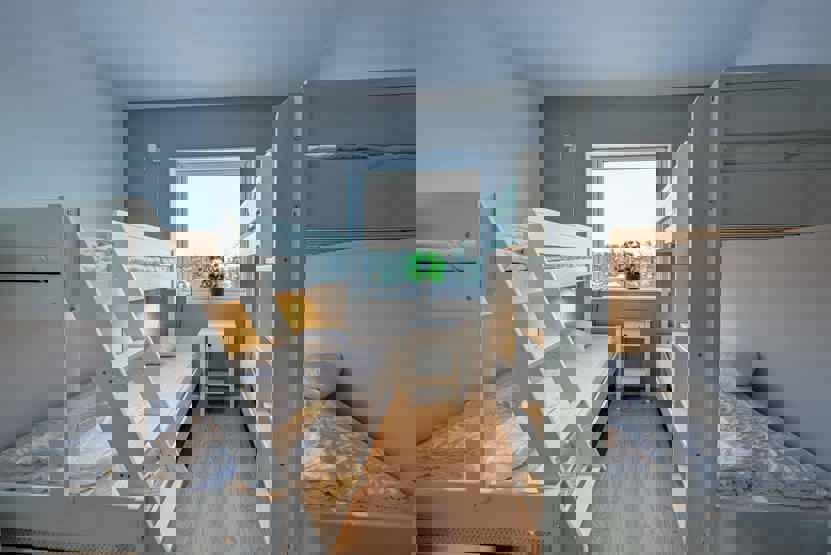Soveværelse-1= 1 dobbeltseng 180 cm bred. Soveværelse-2= 1 køjeseng hvor både over og underkøje er 90 cm bred, 1 køyeseng med 120 cm bred underkøye og 90 cm bred overkøye.