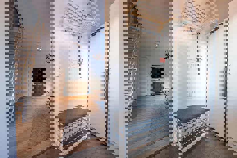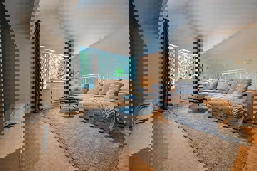 Opholdsstue med køkkenafdeling, og opholdsstue på øverste etage.
