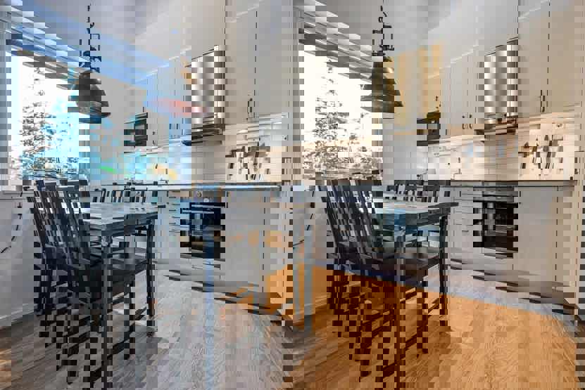 Køkkenet indeholder: elkomfur med ovn, køleskab, frys, opvaskemaskine, microovn.