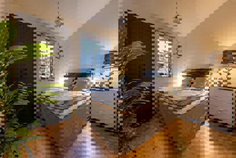 Soveværelse-1= 1 dobbeltseng 180 cm bred. Soveværelse-2= 1 køjeseng hvor både over og underkøje er 90 cm bred.