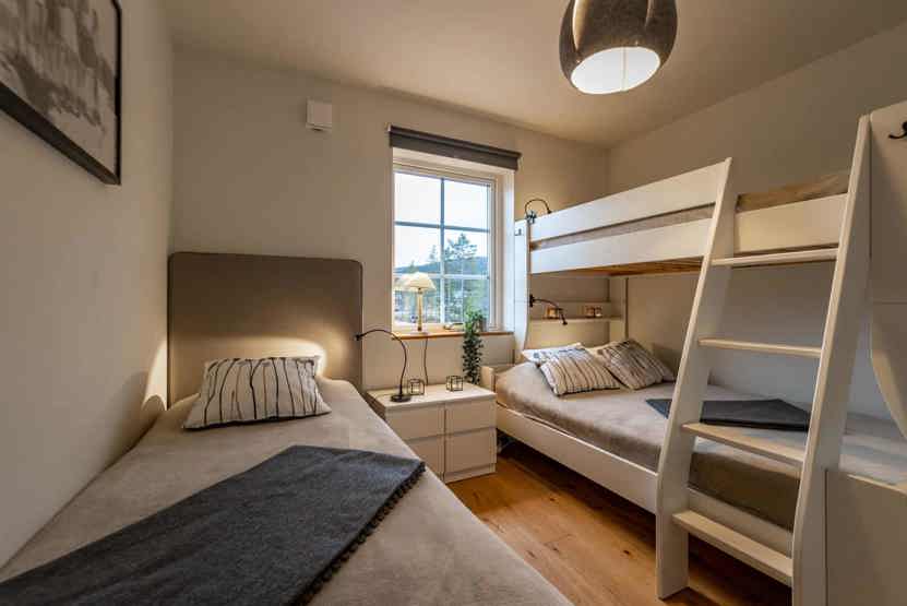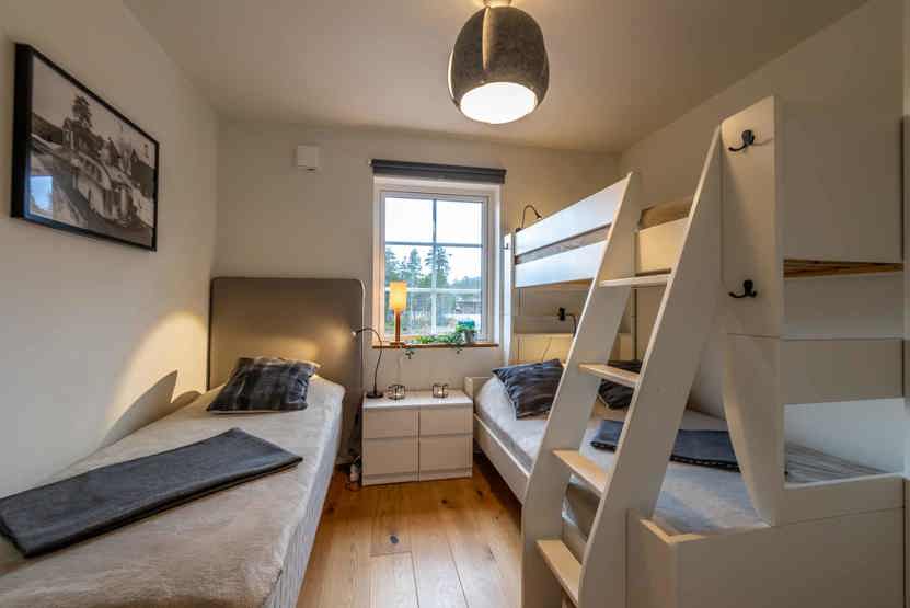 Soveværelse-1= 1 enkeltseng 80 cm bred, 1 køyeseng med 120 cm bred underkøye og 90 cm bred overkøye. Soveværelse-2= 1 enkeltseng 80 cm bred, 1 køyeseng med 120 cm bred underkøye og 90 cm bred overkøye.
