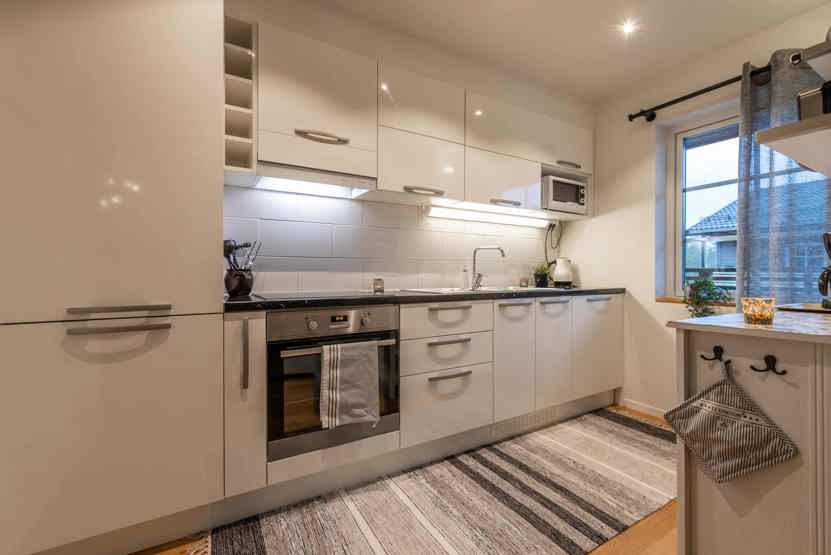Køkkenet indeholder: keramiske kogeplader, indbygningsovn, køleskab, frys, opvaskemaskine, microovn.