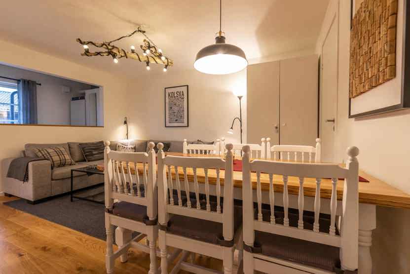 Opholdsstue med køkkenafdeling. TV, tørreskab, rum til skiudstyr.
