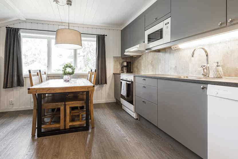 Køkkenet indeholder: keramiske kogeplader med ovn, køleskab, frys, opvaskemaskine, microovn.