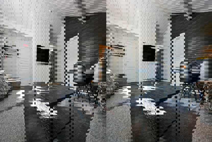 Opholdsstue med køkkenafdeling. TV, tørreskab, rum til skiudstyr, altan (skovles ikke).