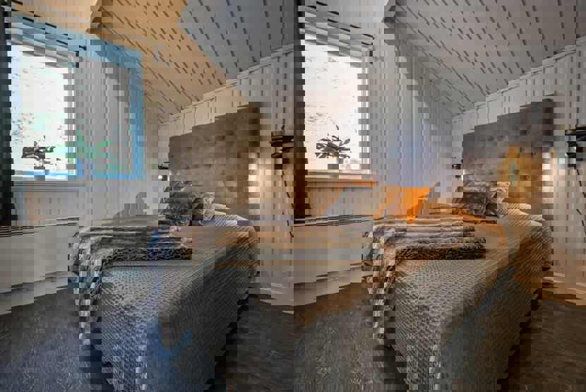 Soveværelse-1= 1 dobbeltseng 160 cm bred. Soveværelse-2= 1 køyeseng med 120 cm bred underkøye og 90 cm bred overkøye.