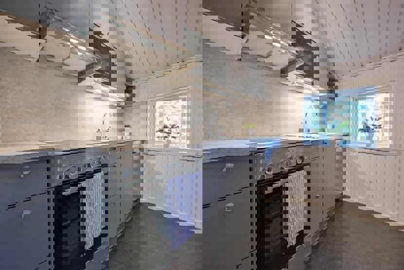 Køkkenet indeholder: elkomfur med ovn, køleskab, frys, opvaskemaskine, microovn.