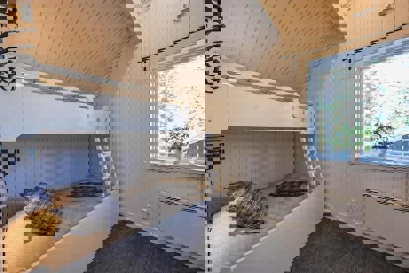 Soveværelse-1= 1 dobbeltseng 160 cm bred. Soveværelse-2= 1 køyeseng med 120 cm bred underkøye og 90 cm bred overkøye.