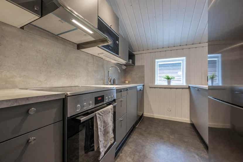 Køkkenet indeholder: elkomfur med ovn, køleskab, frys, opvaskemaskine, microovn.