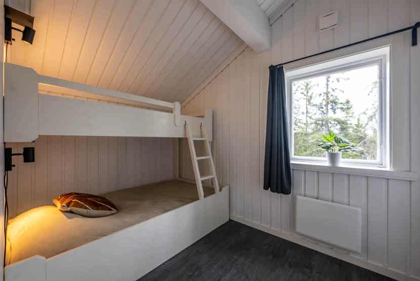 Soveværelse-1= 1 dobbeltseng 160 cm bred. Soveværelse-2= 1 køyeseng med 120 cm bred underkøye og 90 cm bred overkøye.