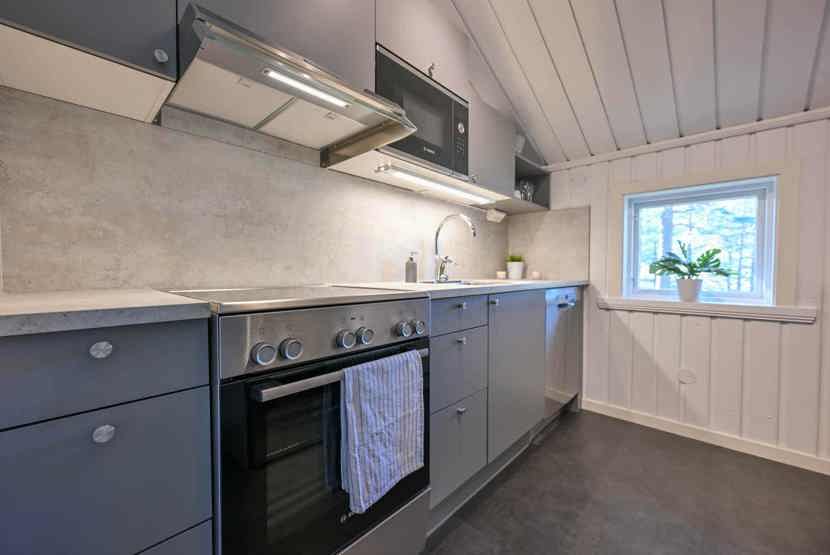 Køkkenet indeholder: elkomfur med ovn, køleskab, frys, opvaskemaskine, microovn.