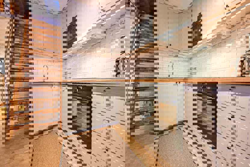Køkkenet indeholder: elkomfur med ovn, køleskab, frys, opvaskemaskine, microovn.