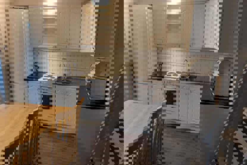 Køkkenet indeholder: elkomfur med ovn, køleskab, frys, opvaskemaskine, microovn.