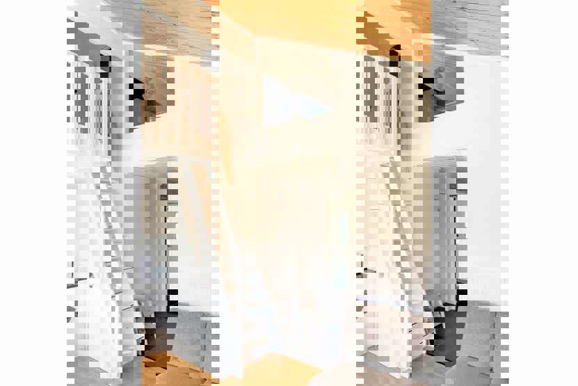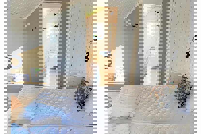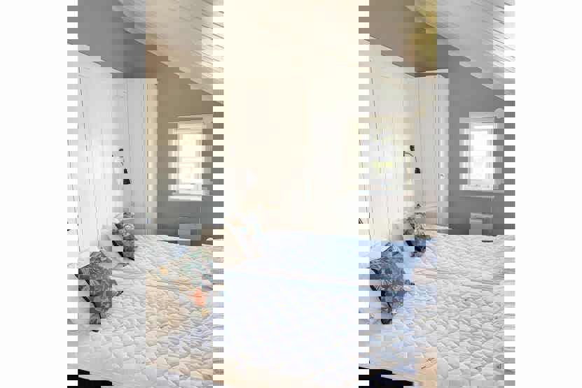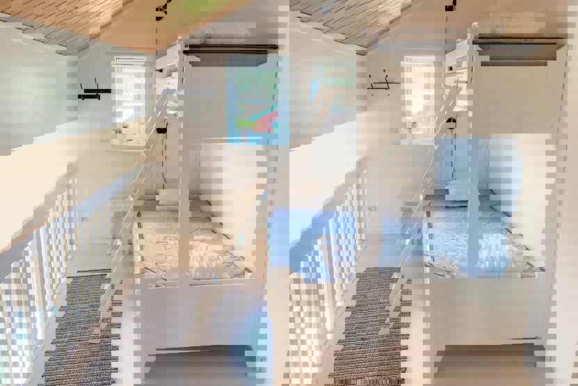 Hems 1= et soveværelse med 1 dobbeltseng, 1 køjeseng med 120 cm bred underkøje , Stejl trappe.