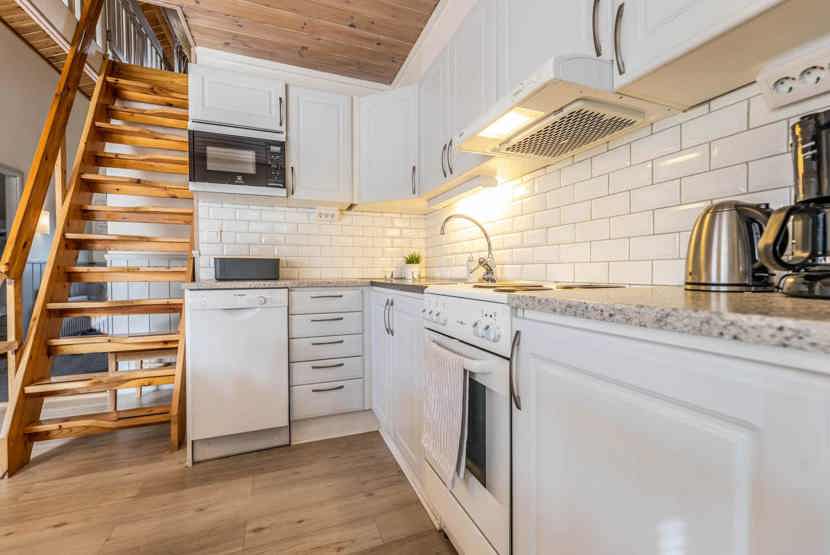 Køkkenet indeholder: elkomfur med ovn, køleskab, frys, opvaskemaskine, microovn.
