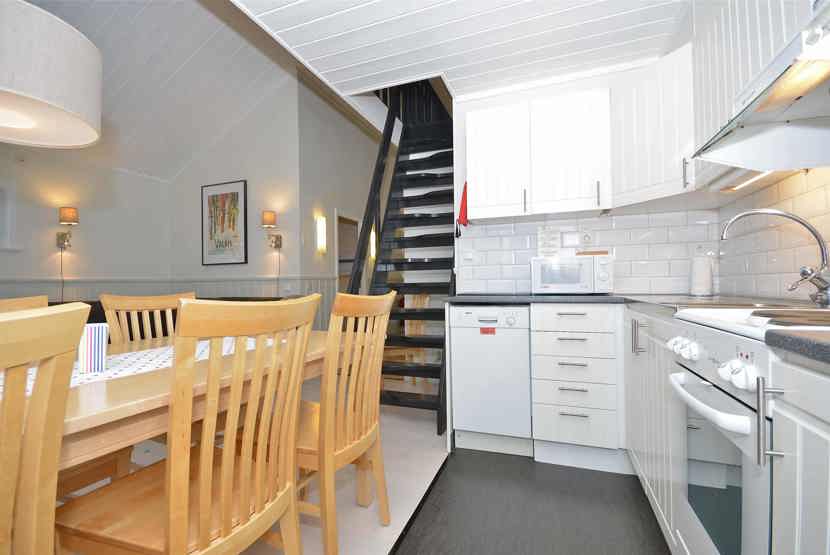Køkkenet indeholder: elkomfur med ovn, køleskab, frys, opvaskemaskine, microovn.