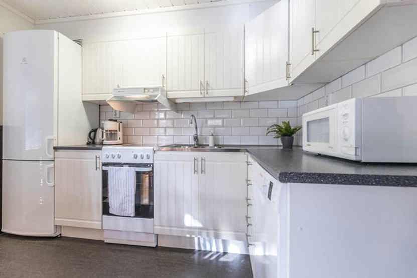Køkkenet indeholder: elkomfur med ovn, køleskab, frys, opvaskemaskine, microovn.