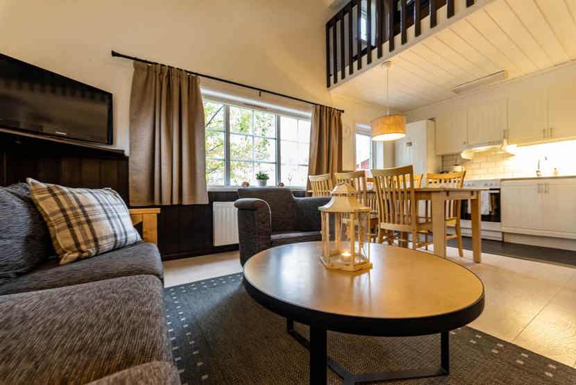 Opholdsstue med køkkenafdeling. TV, tørreskab, rum til skiudstyr, altan (skovles ikke).
