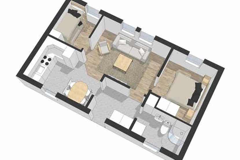 Experiumtorget ligger i Lindvallen. Lejlighed, 4+1 sengepladser, 45 m², opholdsstue, køkken, 2 soveværelser, 1 bruser, 1 WC.