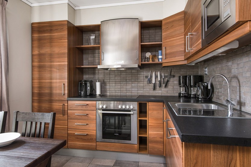 Køkkenet indeholder: keramiske kogeplader med ovn, køleskab, frys, opvaskemaskine, microovn.
