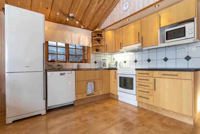 Køkkenet indeholder: keramiske kogeplader med ovn, køleskab, frys, opvaskemaskine, microovn.