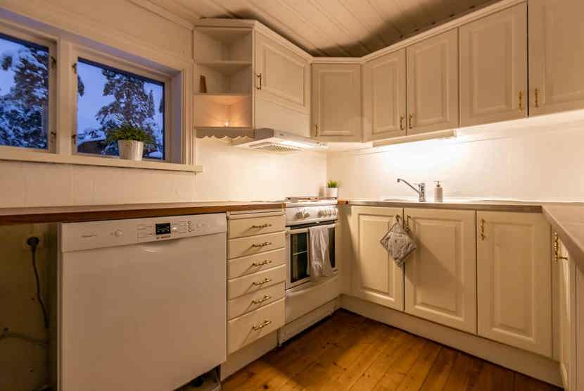 Køkkenet indeholder: elkomfur med ovn, køleskab, frys, opvaskemaskine, microovn.