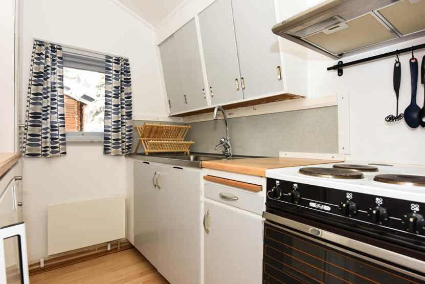 Køkkenet indeholder: elkomfur med 3 plader og ovn, køleskab, microovn, frostboks.