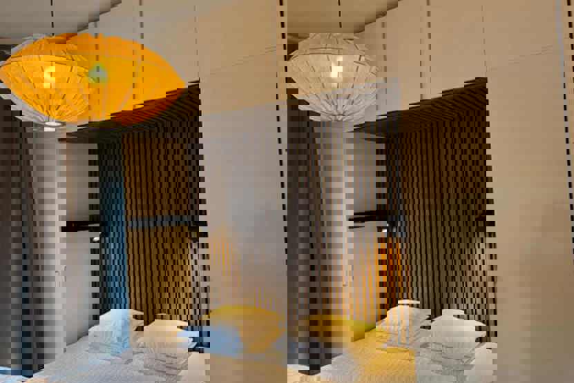 Soveværelse-1= 1 dobbeltseng 180 cm bred. Soveværelse-2= 1 køyeseng med 120 cm bred underkøye og 90 cm bred overkøye.